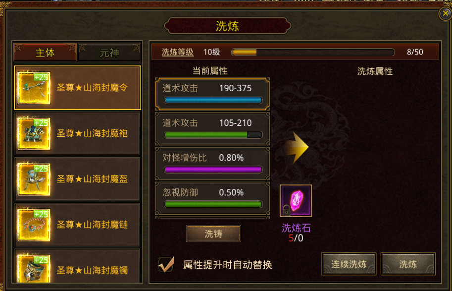 2、勾选属性提升时自动替换方可进行连续洗炼,连续洗炼的过程中会进行属性的自动替换;